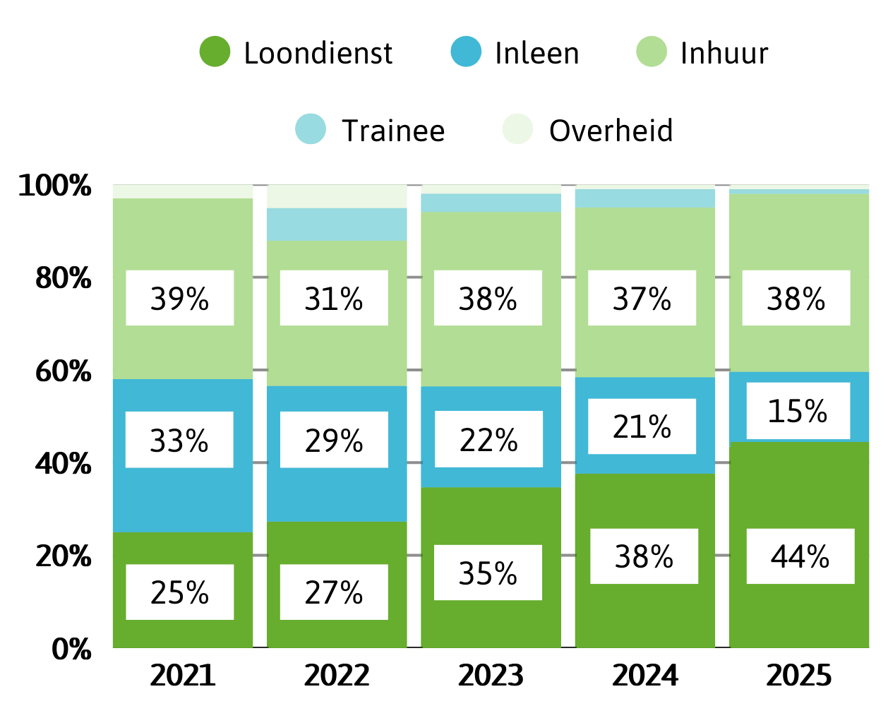 Nadat we hiertoe ruimte van het bestuur voor hebben gekregen is het aandeel medewerkers vast in dienst is gestegen naar 44%. Hiermee beperken we (relatief dure) inzet van inhuur uit de markt en creëren we stabiliteit en behoud van kennis binnen de organisatie.