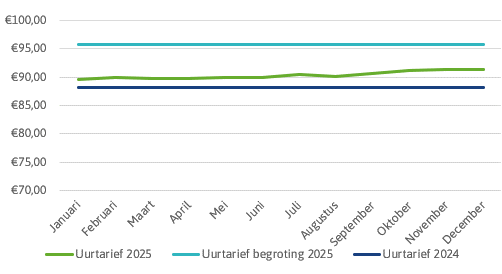 Het gemiddelde uurtarief lag in 2025 op € 91,34. Dit ligt € 4,41 onder het begrotingstarief. Het eerste half jaar is het stabiel rond de € 90,00 gebleven. In juli is een stijging van het uurtarief zichtbaar, omdat in de CAO afspraken zijn gemaakt over een salarisverhoging in juli.