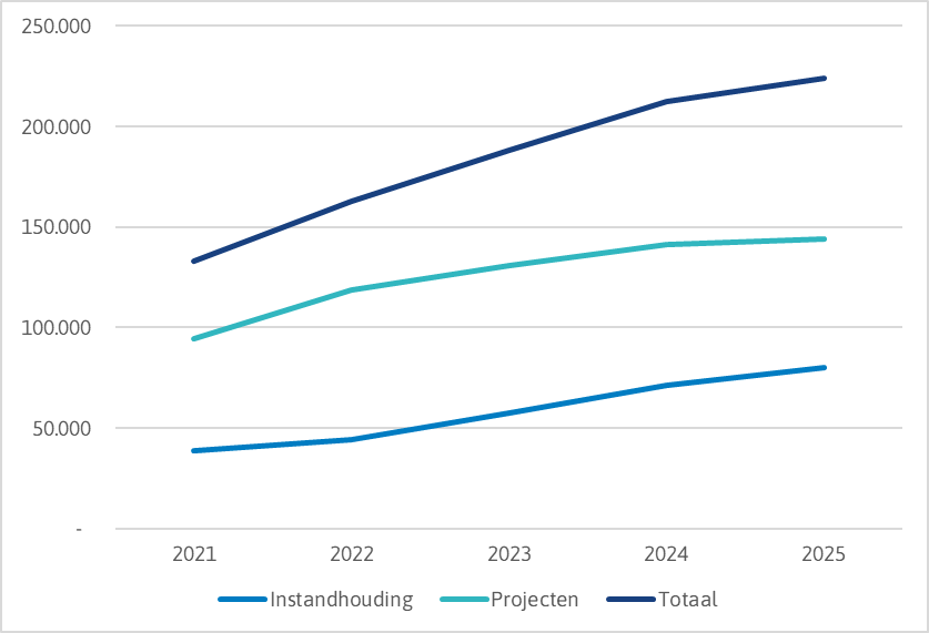 De primaire begroting van € 39,9 mln is gedurende het jaar bijgesteld naar uiteindelijk € 39,3 mln. Dit komt enerzijds door bijstelling naar boven van € 1,9 mln door toevoeging van nieuwe activiteiten middels DVO’s. En anderzijds door bijstelling naar beneden van € 2,5 mln, daar waar we een lagere realisatie verwachten op basis van de meest actuele planning, of goedkoper konden werken.